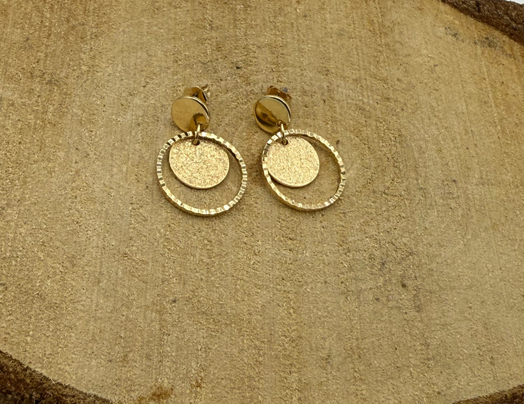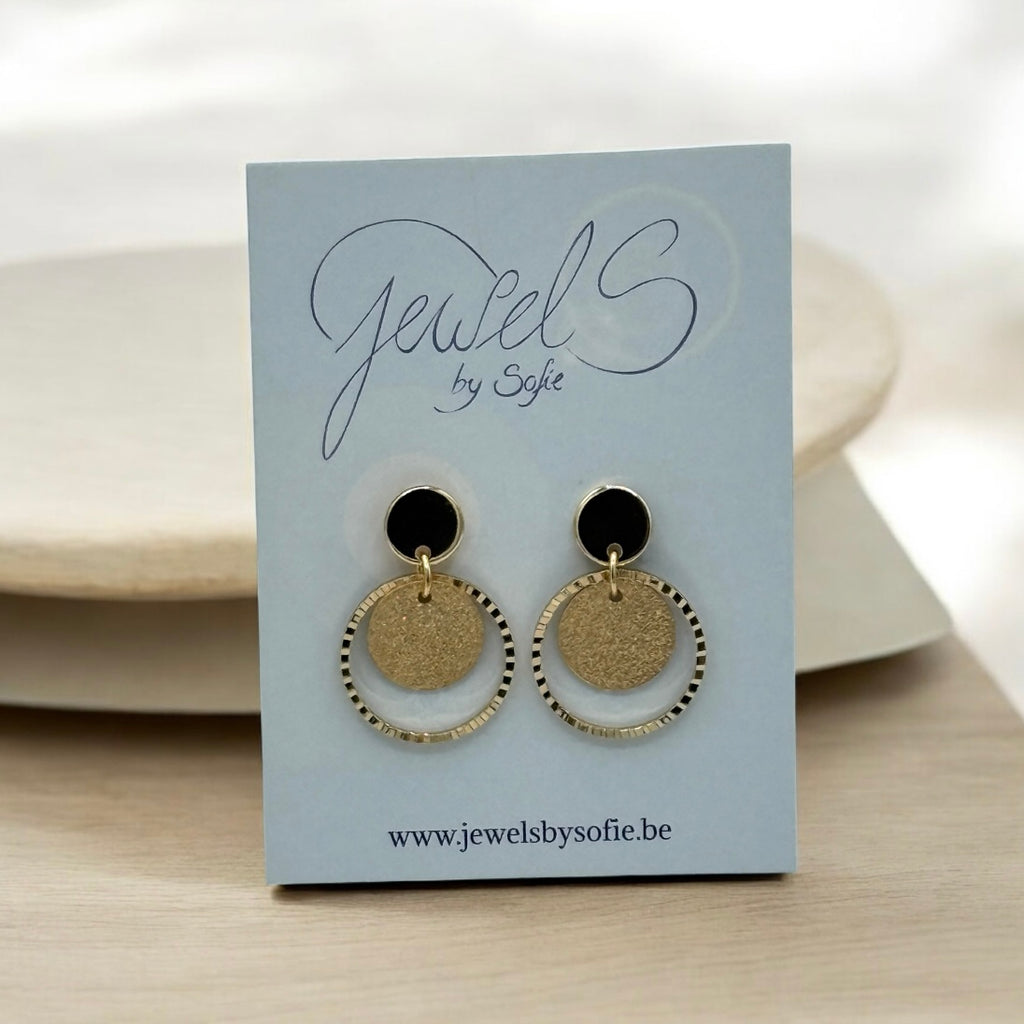 Voeg een vleugje moderne elegantie toe aan je look met deze stijlvolle oorbellen van Jewels by Sofie. Het design combineert een glanzende goudkleurige cirkel met een gouden steker en een speels goudkleurig muntje in het midden. Het resultaat is een tijdloos en chic sieraad dat bij elke outfit past – van casual tot feestelijk.