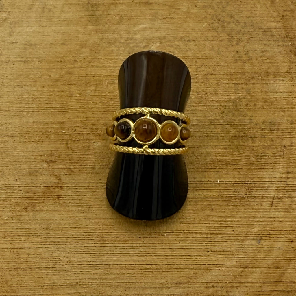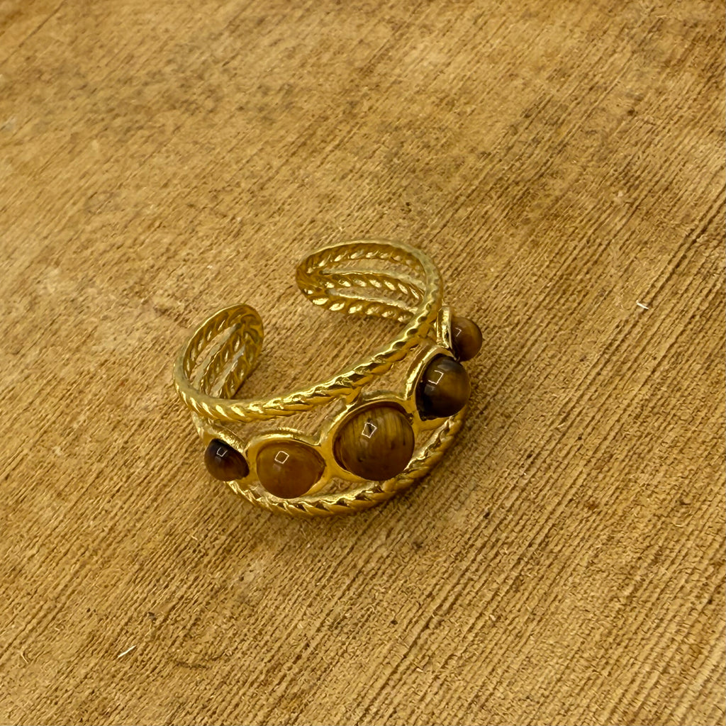 Goudkleurige ring met bruine steentjes uit edelstaal, ring is aanpasbaar in grootte.