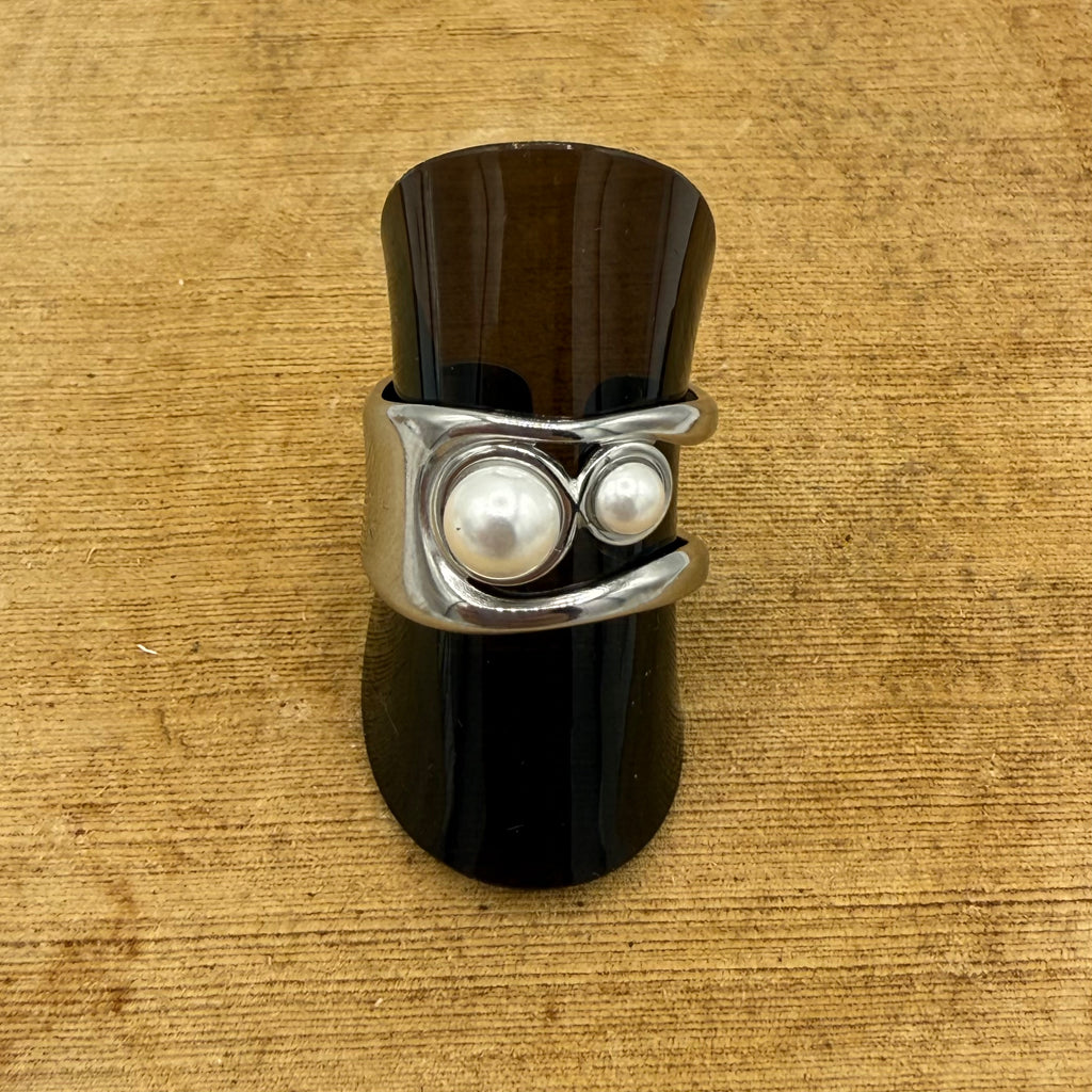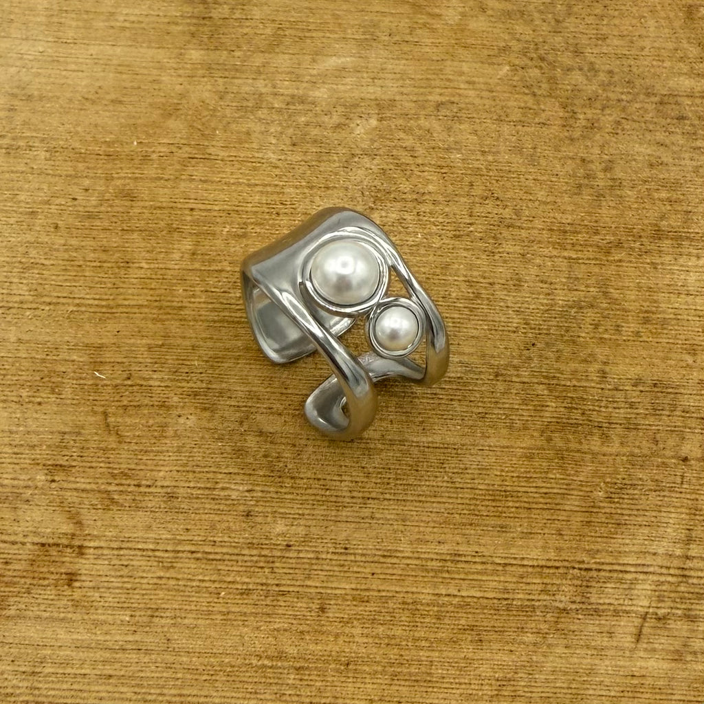 Ring zilverkleurig met parel uit edelstaal, ring is aanpasbaar in grootte.